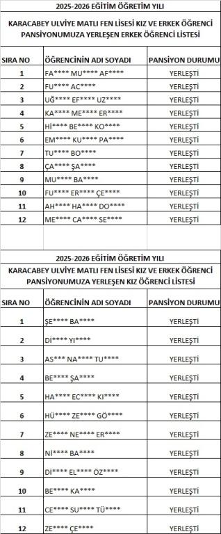 2025-2026 Eğitim Öğretim Yılında okulumuz pansiyonuna yerleşen öğrencilerimiz aşağıda yer almaktadır.